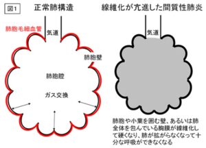 とは、肺の奥にある肺胞の壁(間質)に炎症や損傷が生じ、線維化によって厚く硬くなることで、酸素と二酸化炭素のガス交換が障害される病気です。線維化が進行すると肺は縮み、気道が拡張して蜂巣肺と呼ばれる状態になることもあります。主な症状は痰を伴わない咳や労作時の息切れで、進行すると安静時にも呼吸困難を感じます。経過中に急激な悪化を起こす「急性増悪」を生じることもあります。